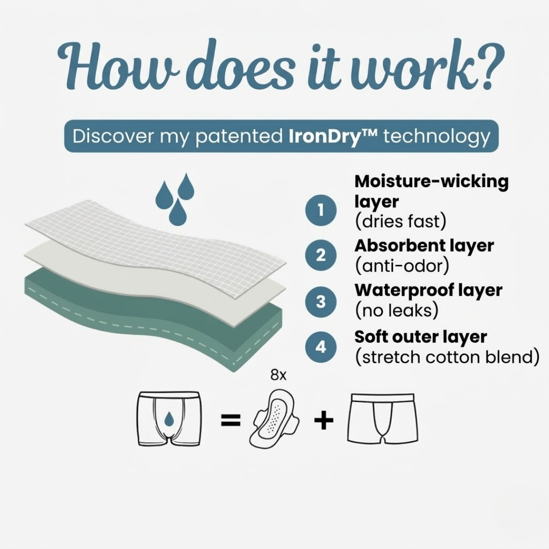 My boxers are designed for men who need a little extra security – without the hassle. Whether you’re dealing with a few drops or regular leaks, my boxers keep you dry thanks to my patented IronDry™ technology.